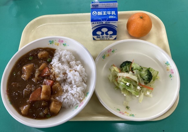 チキンカレーライス,牛乳,花野菜サラダ,ぽんかん