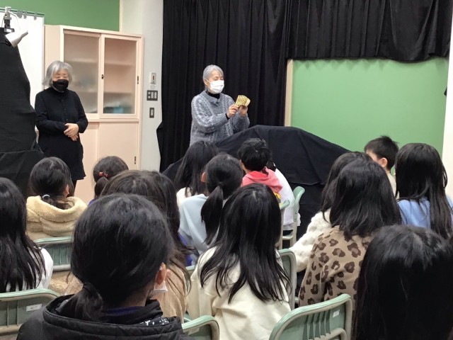 1月21日は、ブラックパネルシアターがありました。始まる前から「今年はどんな話が聴けるのかな」とワクワクの子どもたち。今年は、毎年おなじみの「かっぱ」の手遊びから始まり、「親切なともだち」、「まっくろネリノ」、「竹取物語」のお話を聴きました。竹取物語は、グロッケンのきれいな音色に合わせて歌を歌い、竹取物語の世界に入り込んでお話を聴きました。