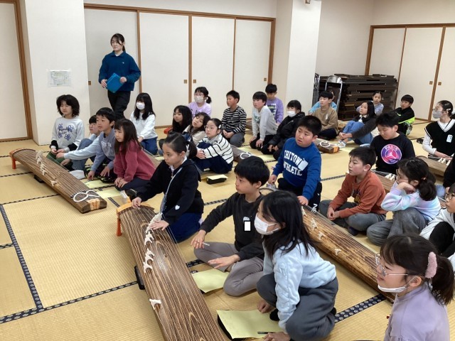 1月22日箏教室が行われました。ララシ、ララシと鍵盤ハーモニカで吹いていたさくらの曲を「七七八」「七七八」と箏の絃(げん)に置き換えてチャレンジです。
