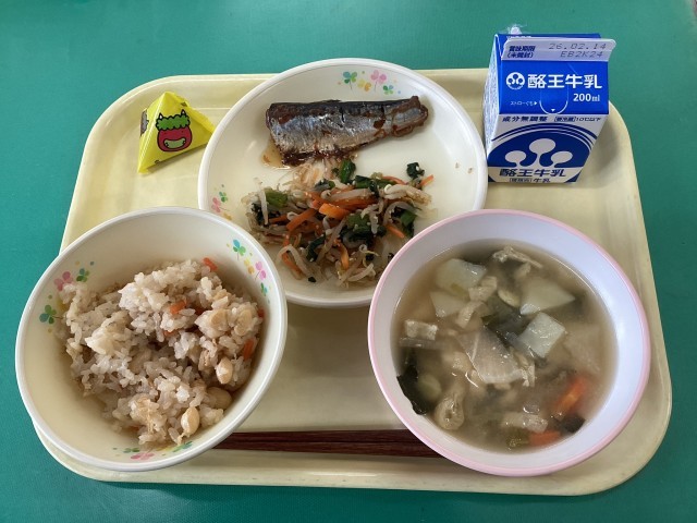 まめごはん,牛乳,いわしの梅煮,三色おひたし,打ち豆汁,節分福豆
