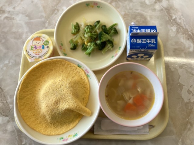 オムライス,牛乳,ブロッコリーのサラダ,野菜とベーコンのスープ,豆乳プリン