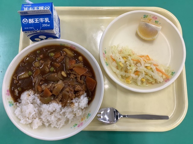 今日の献立は、ポークカレーライス・コーンサラダ・清見オレンジです。