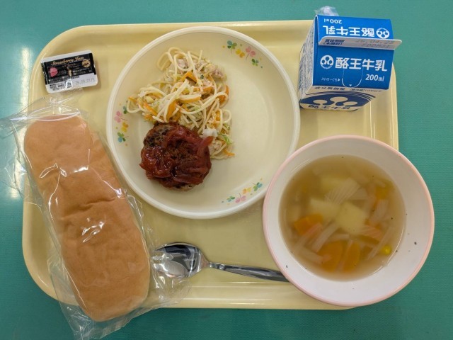 今日の給食は、コッペパン・いちごジャム・ハンバーグトマトソースがけ・サラスパサラダ・コンソメスープです。