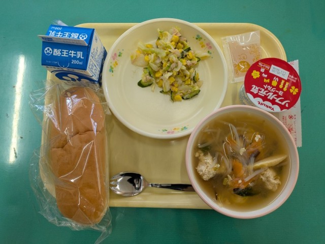 今日の献立は、コッペパン・りんごジャム・ひき肉団子のスープ・ツナサラダ・ヨーグルト・牛乳です。
