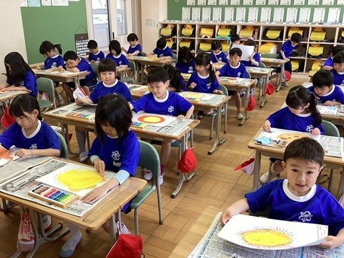 自分だけのおひさまを思い浮かべて、クレパスで描きました。