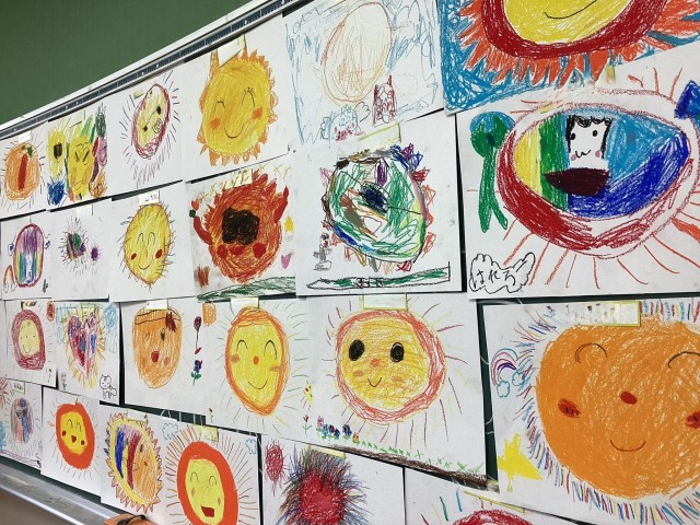 最後に、みんなのおひさまを黒板に貼って、鑑賞会。