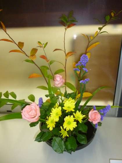 <大切にしたこと>色づいた庭のリョウブとバラ、スプレー菊、チースで明るく生けてみました。