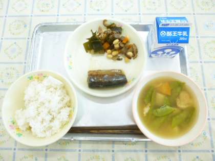 五目煮豆(カミカミメニュー)さやえんどうのみそ汁」