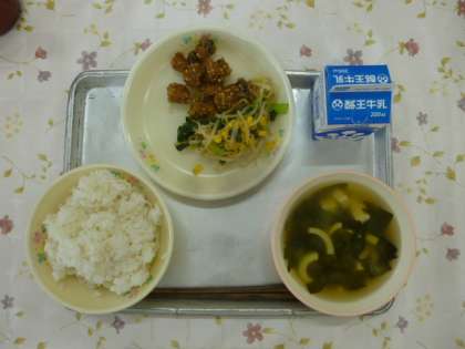 「麦ごはん 牛乳 かつおと大豆ごまみそあえ 小松菜のお浸し 若竹汁」
