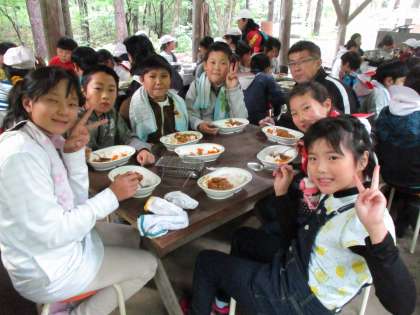 宿泊学習の2日目。午前中から野外炊飯を行いました。メニューは、カレーライスです。班のみんなで協力して、かまどに火をおこしたり、野菜を切ったりしました。どの班もとってもおいしいカレーライスができて、みんな、大満足でした!!