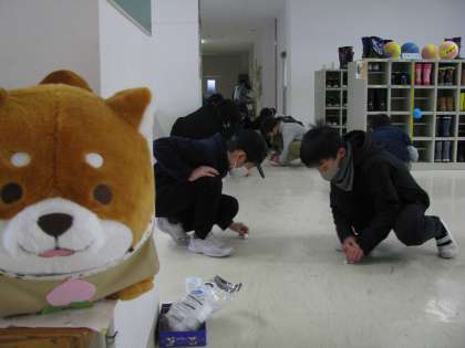 あさ、ボランティアいいんかいのみんなが、ろうかのよごれおとしを、いっしょうけんめい、やっていました。とってもきれいになりました!