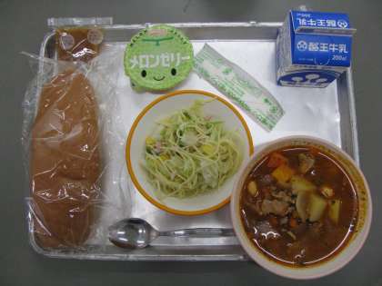 コッペパン、牛乳、ピーナッツクリーム、豚肉と大豆のケチャップ煮、スパゲティサラダ、メロンゼリー
