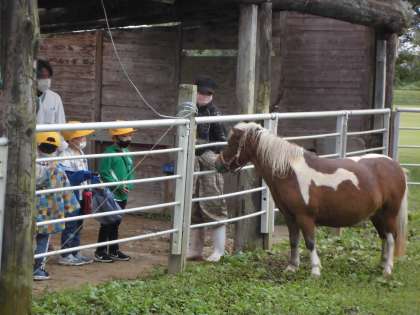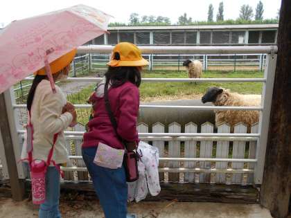 岩瀬牧場には、ポニーや羊、ヤギやウサギが飼育されています。ちょっと雨が強まってきましたが、傘を差したり屋根のある小屋に入ったりして、動物の様子をみたり触ったりしてふれあうことができました。