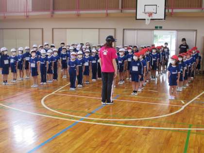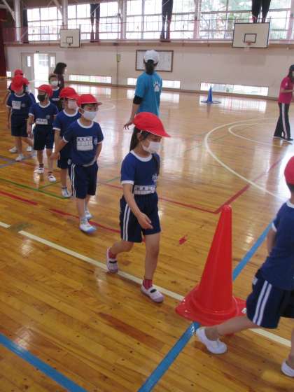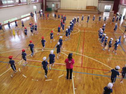 いよいよ、運動会の練習が始まりました。今日は、2年生と運動会の団体種目の練習をしました。低学年の団体種目は「玉入れ」です。今日練習したのは、並び方と移動のしかたです。1年生は、2年生にくっついて歩きながら、大きな丸になったり退場したりする動き方を覚えました。明日は、校庭で運動会本番の動きに挑戦します。上手にできるといいなあ・・・・。