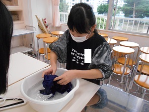6年生は、家庭科の時間に「洗濯」について学習し、実際に自分の体操着を手洗いしました。洗剤の量に気を付けてもみ洗いをしたり、汚れがひどいところは、つまみ洗いをしたりしながら丁寧に取り組みました。体操着をしぼることが難しかったようですが、「楽しい!」といいながら意欲的に取り組むことができました。