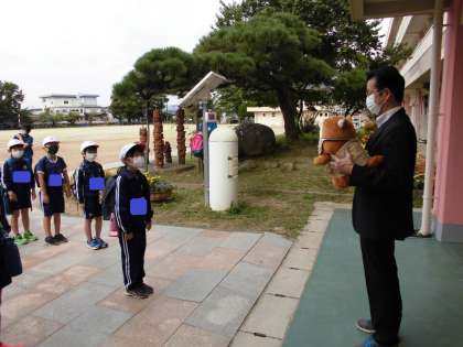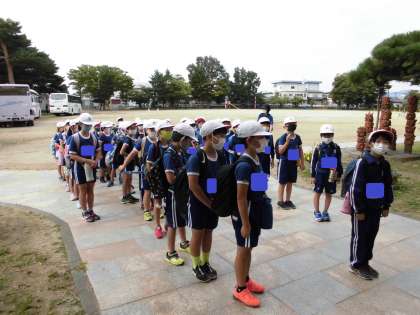 先日の校外学習の様子です。出発する前に、出発式を行いました。元気な声で「行ってまいります」のあいさつをして出かけました。