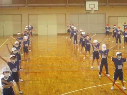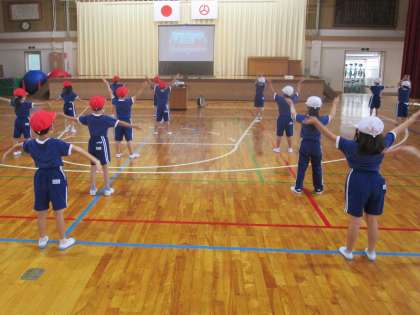 今日は、初めてラジオ体操に挑戦しました。まず、教室で体育主任のお手本映像を見て、その後、体育館で練習しました。どんなことにも真剣に取り組む1年生の子ども達ですから、今日も真剣そのものです。手をしっかり伸ばしたり振ったりして、とても上手にできました。運動会当日、かわいらしいラジオ体操をぜひご覧ください!