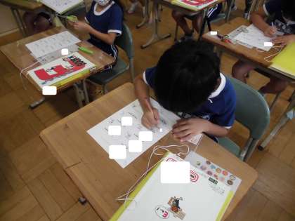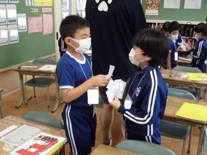 ベンジャミン先生と英語の学習に取り組みました。名刺カードに自分の名前をアルファベットで書いて、友達と「Hi.my name is 名前」「I like 〜.」と自己紹介をして、名刺カード交換をしました。