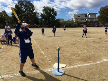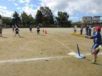 体育の学習で、「ティーボール」に挑戦しています。ティーの上にボールをのせてバットで打ちます。ボールの扱い方やバッドで打つことに、まだ慣れない様子も見られますが、チームで声をかけ合って練習に取り組んでいます。どんな言葉かけがあると、チームとしてがんばれるかということについても話し合い、前向きな気持ちで試合に臨む姿が見られるようになってきました。これからの試合も楽しみです。