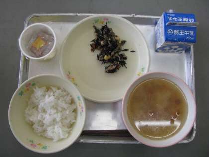 ごはん、牛乳、納豆、ひじきの炒め煮、油麩と大根のみそ汁