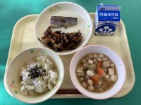 あさか舞100%ごはん,牛乳,いわしの梅煮,さつま揚げと刻み昆布の煮物,凍み豆腐のみそ汁