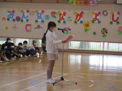 6月7日(火)の3校時に、「ようこそ1年生の会」がありました。6年生の実行委員会が中心となって企画・運営を行いました。2年生がメダルを作り、3年生が招待状をプレゼントしました。4年生は、花のアーチで1年生を迎えました。5年生と6年生は、体育館の飾りつけを担当しました。実行委員長による歓迎の言葉のあと、桃小〇×クイズが行われ、〇×マンが登場して全校生で楽しく盛り上がりました。1年生からのお礼の言葉もあり、短時間でしたが、とても有意義な時間を過ごすことができました。