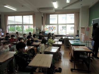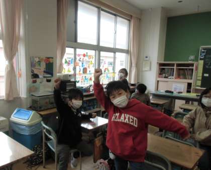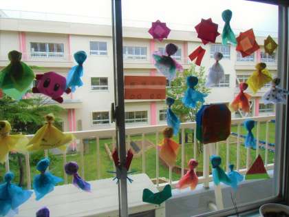 3年生の教室にたくさんのてるてる坊主。明日は3年生の校外学習。天気になるといいですね。