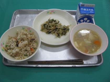 味ごはん,牛乳,小松菜のごまあえ,豚汁