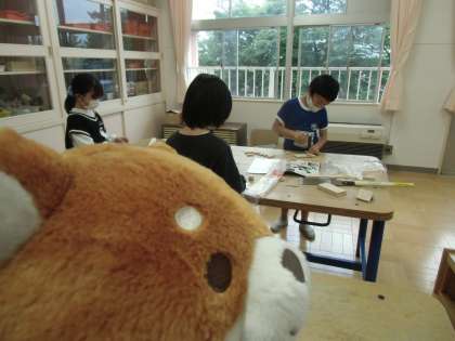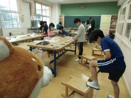 トントントントン。4年生が工作に取り組んでいます。のこぎりや金槌を使ってダイナミックに作品作りに取り組んでいました。