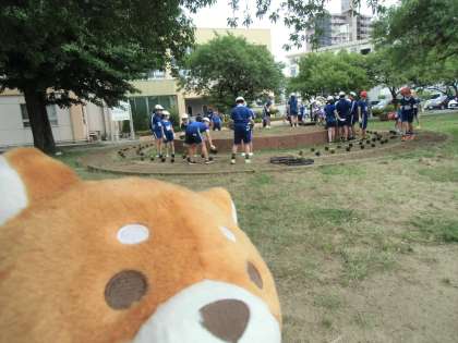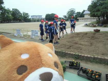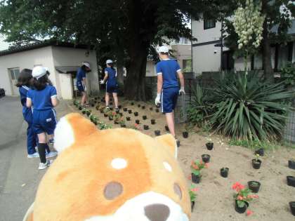 花壇の設計図を見ながら、5・6年生が力を合わせて花の苗を並べました。ももみの花文字の準備も。ももしばワンも見入ってしまいました。協力し合って活動し、明日の作業の準備ができました。