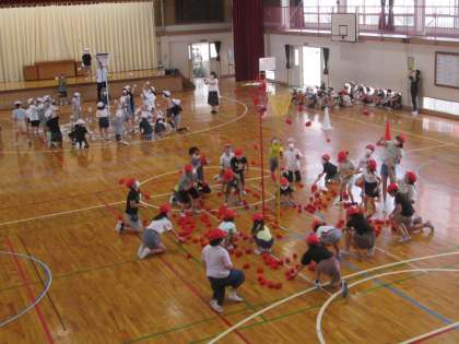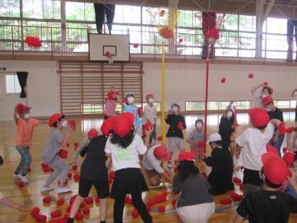 今日は、2年生と5年生の「なかよし桃見っ子」がありました。今年の異学年活動は、コロナ禍のためになかよし学年での開催となっていて、今日は、5年生の企画・運営で「紅白対抗玉入れ」を楽しみました。今日の特別ルールは、「5年生は膝をついてやること」でしたが、運動会の時に負けないぐらいたくさん玉が入って、2年生の子ども達も大喜びでした。業間の短い時間でしたが、他の学年との一緒の活動は、新鮮で楽しかったようです。