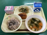 麦ごはん,ひじき手づくりふりかけ,牛乳,生揚げの肉みそ煮,からしあえ
