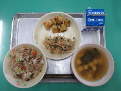 五目ごはん,牛乳,ほうれんそうともやしのごまあえ,豆腐とわかめのみそ汁,大学いも