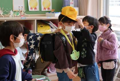 2組では、生活科「冬をたのしもう」で作った風車を年長さん達に貸して一緒に遊びました。そして教室では、学校生活をイメージしてもらえるよう、1年生の1日の生活や教科書などの持ち物について紹介しました。