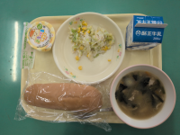 ごはん,牛乳,鶏肉の竜田揚げ,ひじき入りおひたし,打ち豆汁,プリン