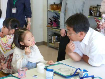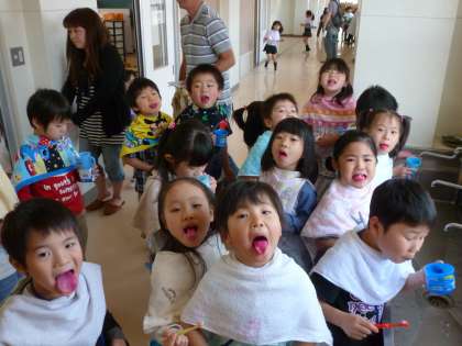さて、参観日では1年生が「はのみがきかた」について学習しました。どの子も鏡をみながら一生懸命きれいにみがいていました。