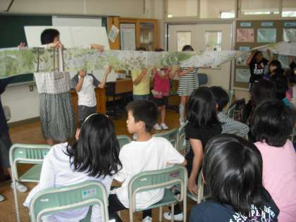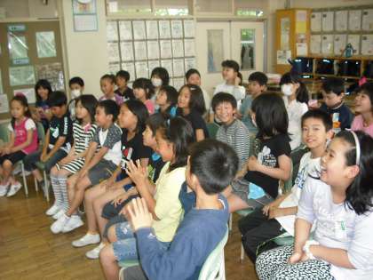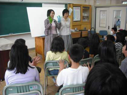 内容は、「かっぱ」(手袋人形)、「こおりやまの青い空」、「おとうさんのちず」、「かわ」、「これはジャックのたてた家」(パネルシアター)の5つでしたが、特に、「こおりやまの青い空」は、木村芳子さん作の非売品の絵本で、桃小学区のパラマウント工場などの空襲のようすを子どもたちに伝えるすばらしい作品を聞かせていただきました。3年生の時に聞かせていただいた戦争のお話からはじまることで、子どもたちも、昨年の内容を思い出しながら、興味深く聞いていました。