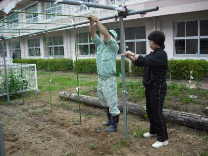 この日のために主任用務員の松崎さんが、中庭を耕しておいてくださり、本日も、ネット張りや支柱立てを手伝ってくださいました。ありがとうございます。