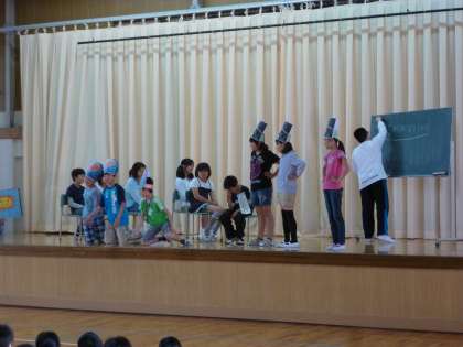 「朝ご飯の働きを考えよう」というテーマのもと、寸劇やダンスで表現しました。全校生のみんなで楽しく朝ご飯ダンスを踊りました。