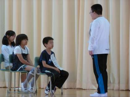 今朝は全校集会で、給食委員会の発表がありました。