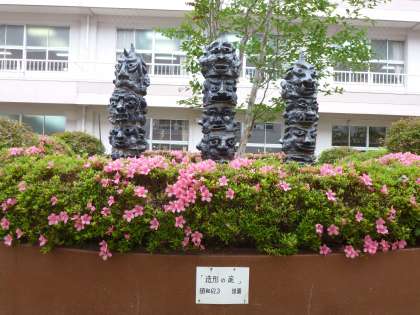 中庭には以前作られた像が建っています。それらを造形の森と呼ぶのですが、きれいなサツキが咲いていました。