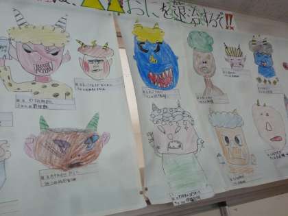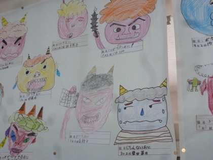 3年生の教室にあった掲示物にふと目がとまりました。節分の時に描いた鬼の絵です。それぞれ思い思いの弱点を追い出そうとかいたものです。