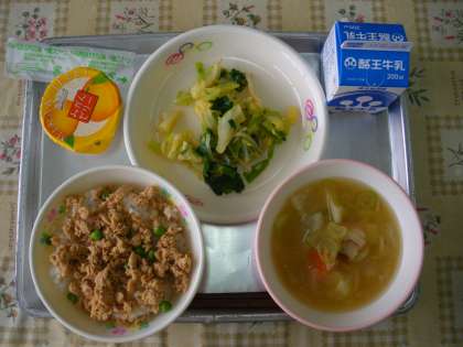 さかなでんぷ丼 牛乳 キャベツとにらのおひたし