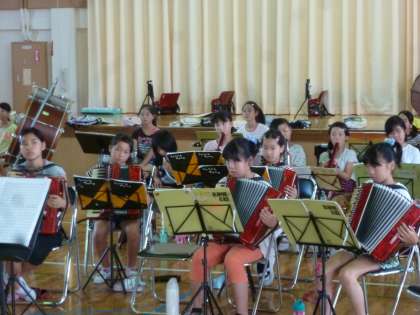 さて、学校では午前中に特設合奏部のみなさんが、一生懸命練習に励んでいます。長瀬先生を中心によい演奏にしようとがんばっています。