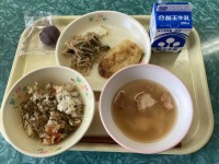 <いわき市郷土料理>ツナごはん,牛乳,キャベツと小松菜のサラダ,八杯汁