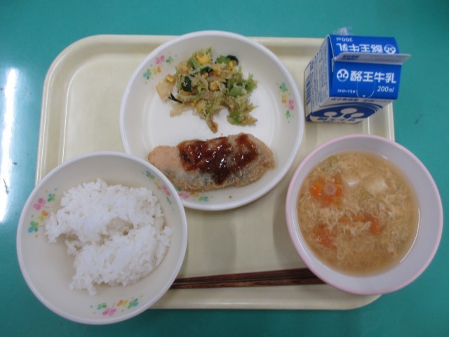 今日の献立は、ごはん・鮭フライ・ごま風味あえ・かき玉汁・牛乳です。