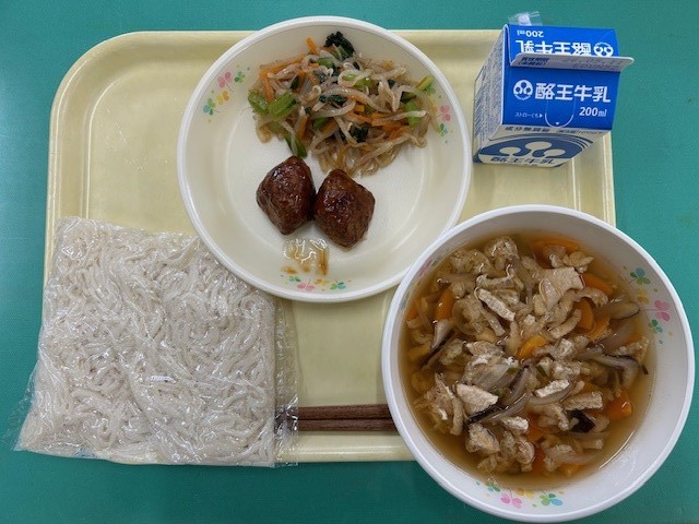 今日の献立は、きつねうどん・野菜肉団子・おかかあえ・牛乳です。