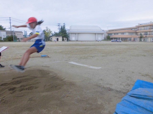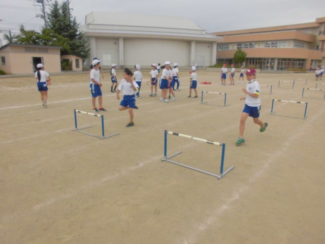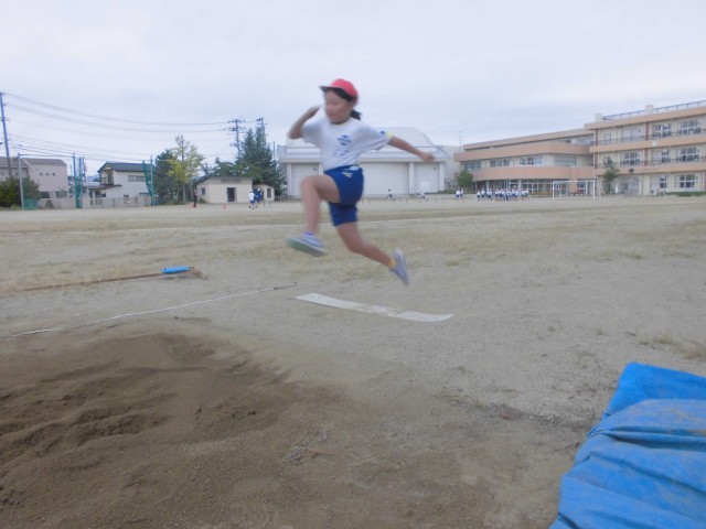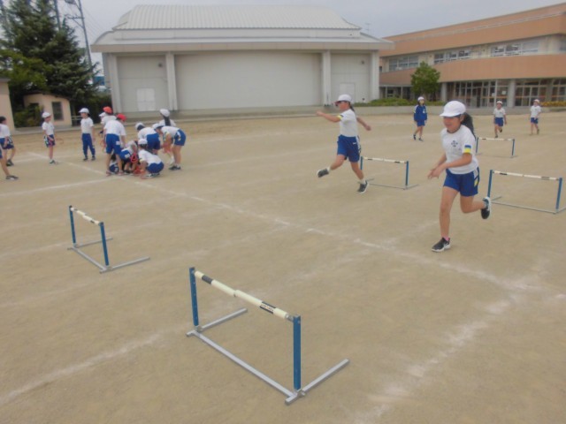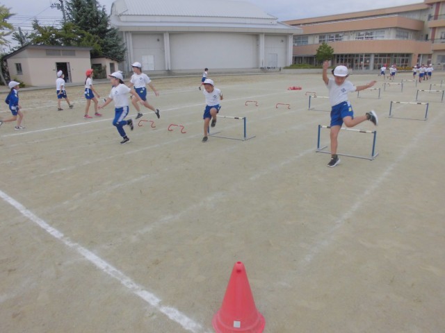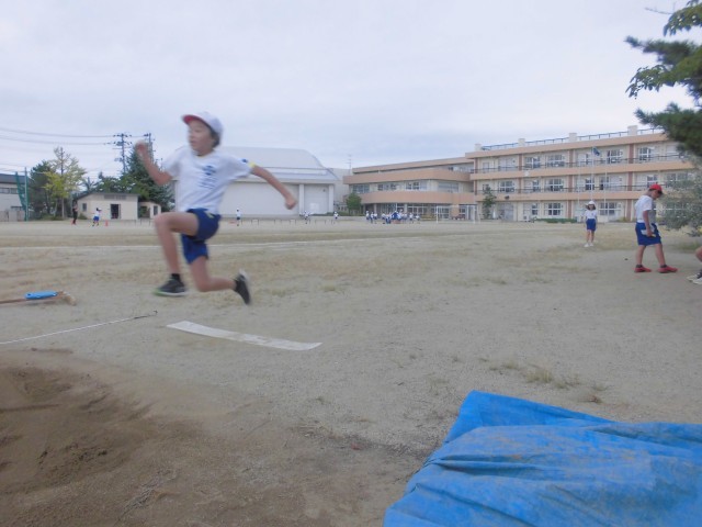 4年生が陸上運動に取り組んでいます。ハードル走の練習では、ミニハードルを使って、リズミカルに飛び越えていく練習に意欲的に取り組むことができました。幅跳びでは、助走スピードに乗って、力強く踏み切ることを意識して、チャレンジしています。何度も繰り返し練習することで、コツやリズムをつかむことができるように頑張りましょう。