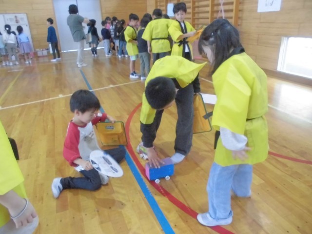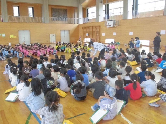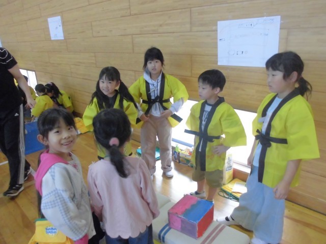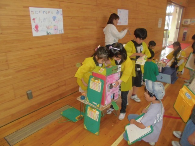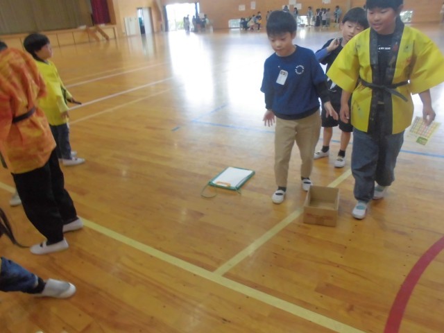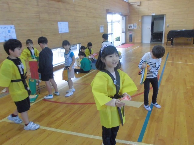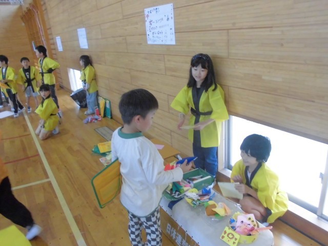 生活科の授業で、2年生が工夫をこらしてつくった「お店屋さん」を体育館に準備し、1年生を招待した「秋まつり」を開催しました。2年生は、グループごとに、お店のゲームのやり方を丁寧に教えたり、一緒にゲームを楽しんだり、手作りのかわいい景品をあげたりする姿が大変頼もしく、微笑ましかったです。1年生も「もぐらたたき」7や「ボウリング」、「ガチャガチャ」、「魚釣り」、「射的」、「輪投げ」、「生歌太鼓の達人」など、たくさんの出店を存分に楽しむことができました。