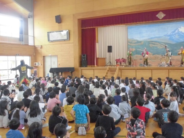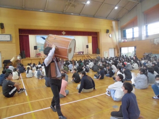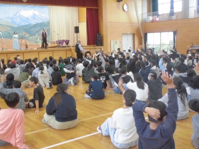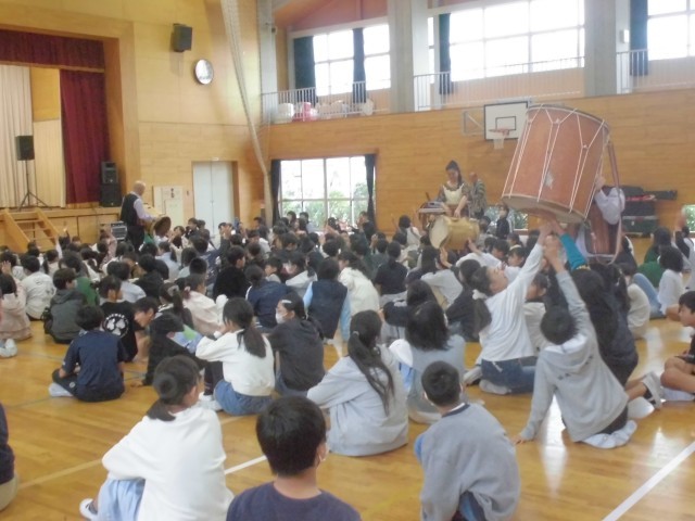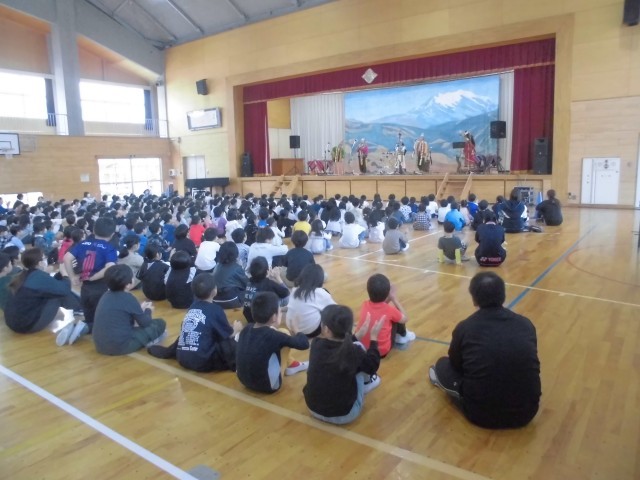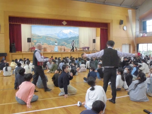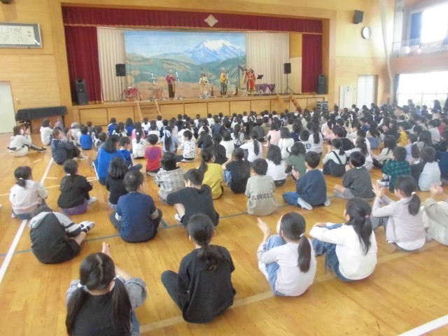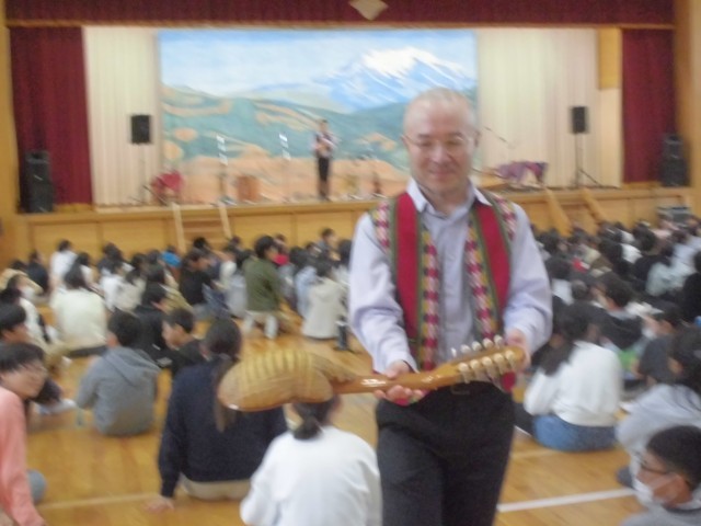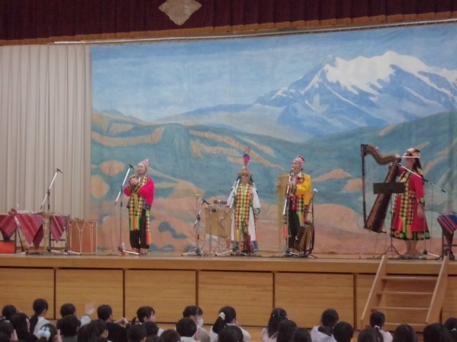 3連休明けの本日、子どもたちが楽しみにしていた芸術鑑賞教室を開催しました。今年度は音楽鑑賞ということで、音楽の授業でも学習する南米アンデス地方の伝統音楽を演奏していただきました。演奏家の皆さんも民族衣装で登場し、ケーナやチャランゴをはじめとする数々の珍しい民族楽器によるアンデス高原地方の祭りの音楽、代表的なフォルクローレを力強く演奏いただきました。子どもたちは手拍子や体全体でリズムをとりながら、聴きいっておりました。